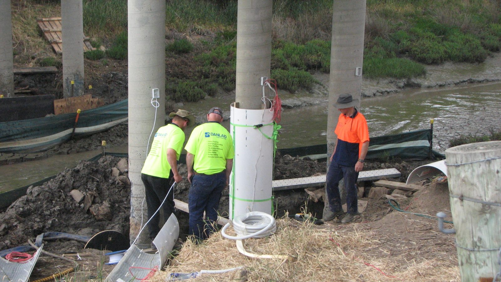 Is one of the LJ collars being installed. The collars are placed around the prepared concrete column and then wired to the steel in the column to provide a continual circuit around the column providing a galvanic current protection for the structure.
